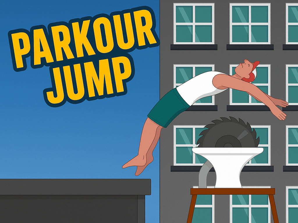 Parkour Jump continues the realistic physics style of Short Life but adds humor. Players control the character to jump over objects such as buses, buildings, or suspended structures, with the goal of reaching the red flag safely.